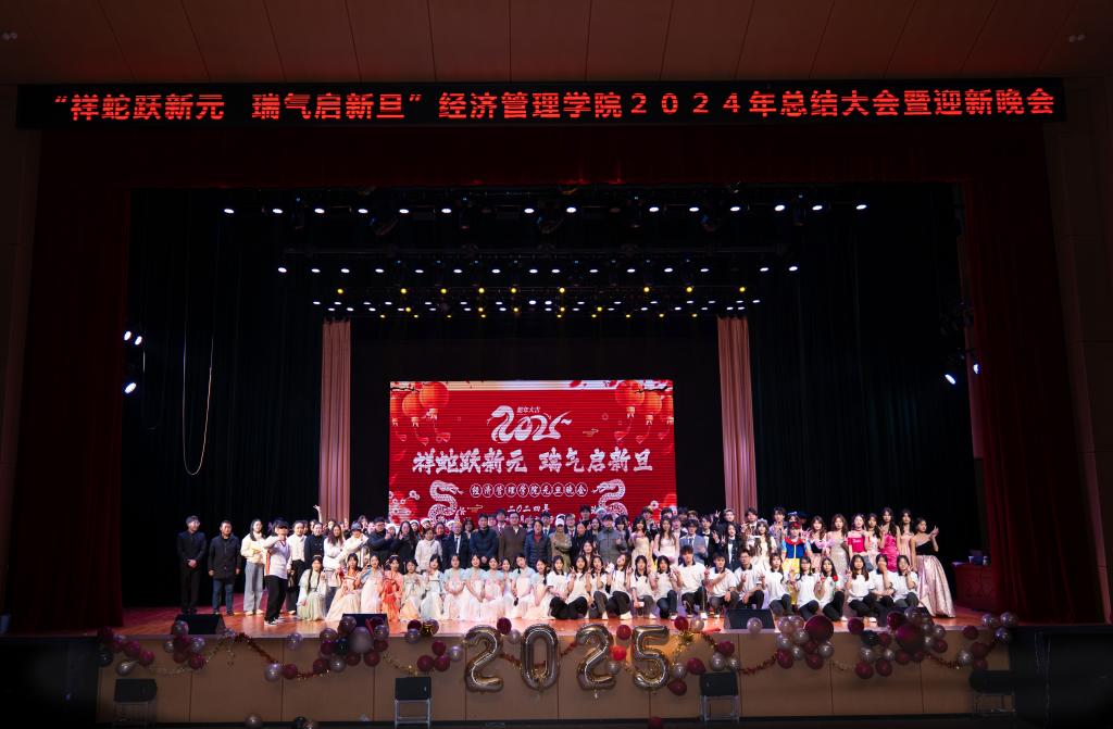 本站讯(经济管理学院 严如玉)蛇舞新春祥瑞绕,齐聚一堂庆新程,12月24日,经济管理学院在出彩大会堂举办2024年总结大会暨迎新晚会。本次晚会以“祥蛇跃新元瑞气启新旦”为主题,校党委委员、副校长刘江毅出席,学院全体老师、学生到场观看。