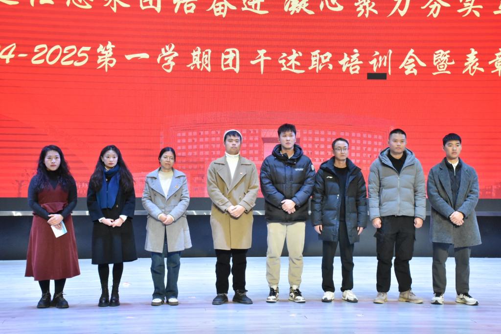 本站讯(团委 曹招 学生记者 李小红)汇聚青春力量,铸就卓越征程。为加强学校共青团和团干队伍的建设,提升团干的综合素质与能力,强化学生组织的凝聚力,确保团学组织保持活力与创造力,12月27日晚,买球官网在博达楼演艺厅召开2024-2025第一学期团干述职培训会暨表彰大会,副校长张彩凤,校党委委员、统战部部长邓伟蓉,校党委委员、宣传部部长马天娥,学工处处长谢海英、校团委书记王玮、各级团学组织负责人及成员共同出席此次大会,会议由刘嘉妮主持。