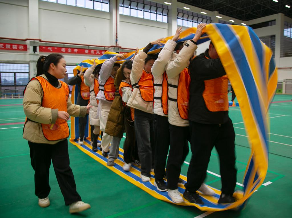 述职大会结束后,全体辅导员“转战”鲲鹏体育馆参加辅导员心理素质拓展活动。辅导员们热情高涨地参与其中,现场气氛热烈。本次心理素质拓展活动精心策划六个项目,包括团队协作类游戏、沟通能力挑战、心理压力释放等多种形式。在活动过程中,辅导员们积极参与、相互配合,充分发挥团队精神,展现出积极向上的精神风貌。活动在欢声笑语中结束,短暂的素质拓展不仅缓解工作压力,还增进彼此之间的了解和信任,进一步提升团队凝聚力。