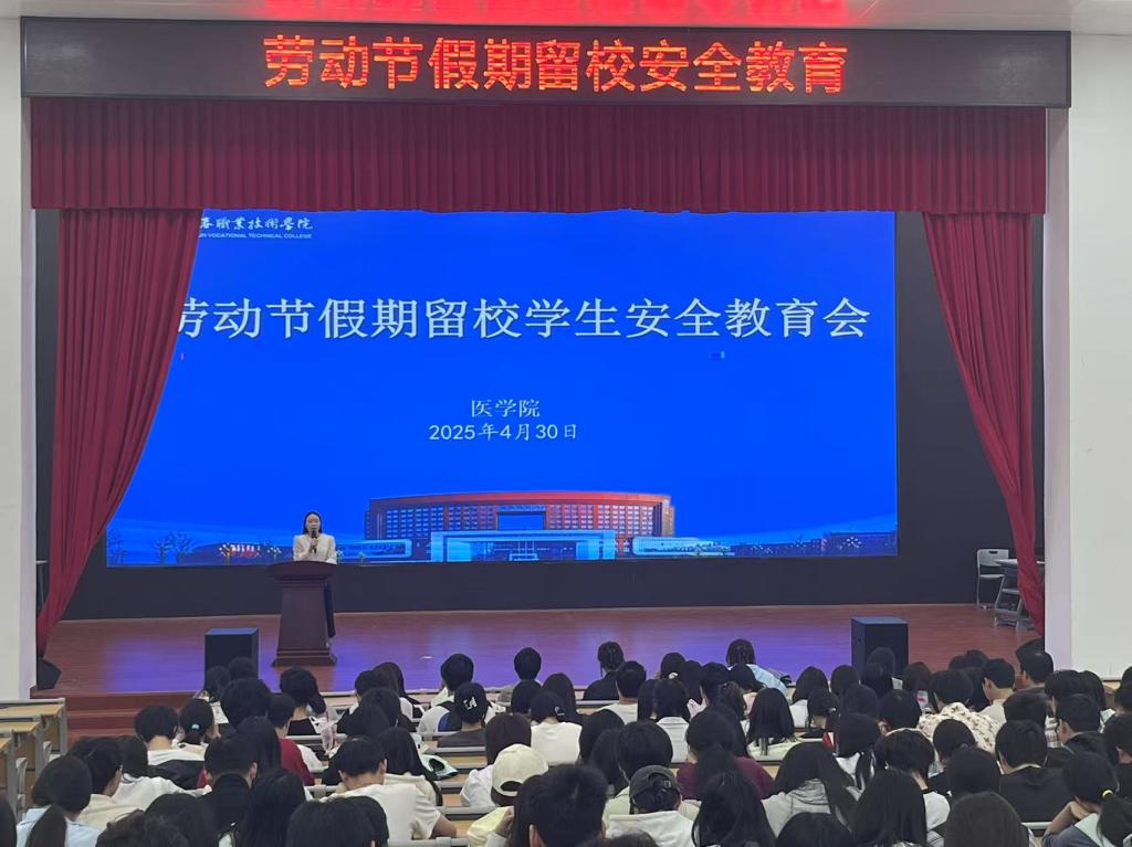本站讯(医学院 刘倩)为切实保障五一假期留校学生安全,强化学生安全教育与管理工作,4月30日中午,医学院(附属医院)在仁济楼小礼堂召开五一假期留校学生安全教育会议,辅导员刘倩主持会议,170余名留校学生参会。