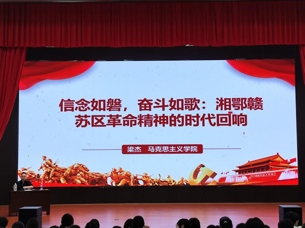 6月5日晚,梁杰老师于仁济楼小礼堂讲授《信念如磐,奋斗如歌:湘鄂赣苏区革命精神的时代回响》。课程以湘鄂赣苏区革命历程为主线,通过“红军医院”“赤色邮路”等历史细节,生动展现了“坚定信念、敢闯新路、无私奉献”的苏区精神特质。