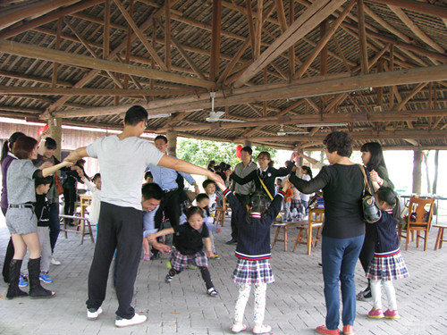 一进入农庄,孩子们就感受到春天的美妙:和煦的阳光、清新的空气、婆娑的柳树、盛开的花朵、碧绿的树叶……好一派生机勃勃的景象。