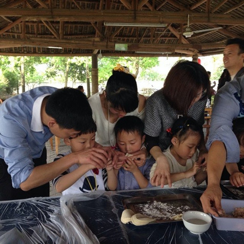 随后,小朋友们和爸爸妈妈其乐融融地包饺子、打糍粑、磨豆浆、做游戏。孩子们学会了饺子的包法、知道了糍粑的制法、见识到了传统石磨的样子,还体会到了自己动手“丰衣足食”的道理。午餐时间,小朋友和爸爸妈妈喝着自己磨的豆浆,吃着自己包的饺子,脸上洋溢着甜蜜的笑容。