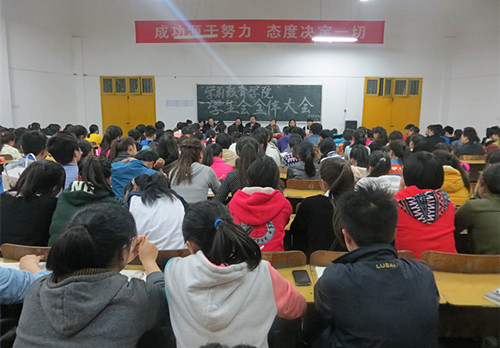 本站讯(学前教育学院 徐卫红)3月17日晚7点,学前教育学院在科技楼阶梯教室召开学生干部大会暨校园专项整治工作动员大会。党总支书记雷水龙,副书记饶丽,学工人员,全体学生会干部参加大会,会议由团总支书记杨文姝主持。