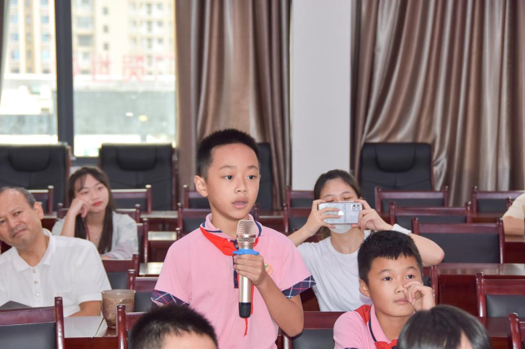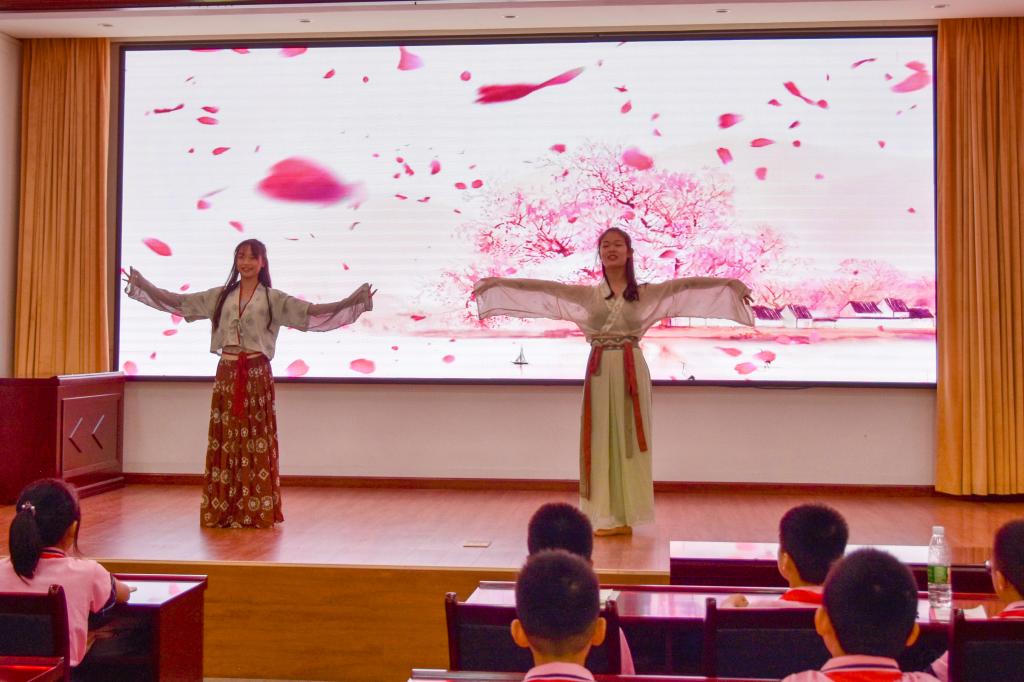 实践队为现场23名小学生进行了专业的普通话训练教学。口部操、气息训练、字词纠正、绕口令和即兴表达,环环相扣,逐步深入,引导孩子们从口腔、气息、字词到句意表达,完成一个完整的语言体验。同时,课堂上师生们还融入了朗诵、民族舞蹈、书法展示、乐器弹唱、趣味游戏等活动,孩子们聆听、模仿、演示、PK、领取奖品…… 丰富多彩、妙趣横生的课堂让他们在学习知识的同时,也收获了欢乐。最后,实践队成员与孩子们一起,手持小红旗,合唱歌曲《红星歌》,倾诉着红心向党的赤诚之情。课堂之后,实践队成员又马不停蹄地来到定江社区进行走访调研,沿街挨户地发放普通话推广公益宣传单,向居民介绍推广普通话的意义,引导居民在日常生活中规范使用普通话等,用实际行动助力美丽乡村的建设。