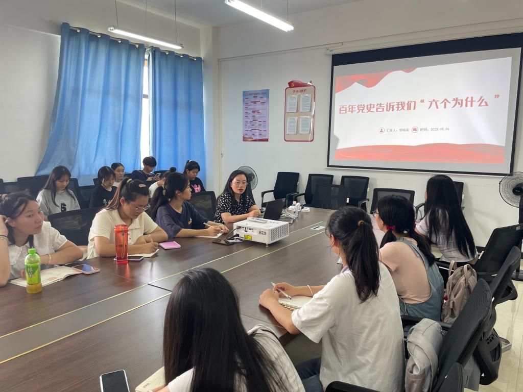 本站讯(师范学院党总支 任玉慧)为引导广大学生感党恩、听党话、跟党走,成为坚定的马克思主义者,推动学生党建、思想政治工作和党史学习教育走深走实,9月26日下午,师范学院党总支在正心楼B204党员活动室开展入党积极分子及新生班级团支书专题党课培训。宜春市“新时代赣鄱先锋”、学院党总支书记邹晓英为同学们讲授“百年党史告诉我们‘六个为什么’”的生动党课。