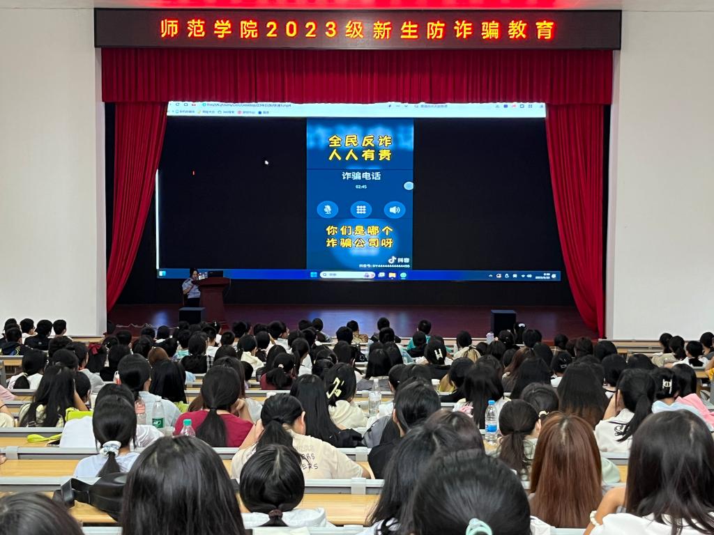 本站讯(师范学院 杨健)为切实加强校园防诈骗宣传教育工作,增强新生识诈、防诈、反诈意识,守护新生财产安全,讲好开学教育反诈宣传,9月22日,学院派出所在师范学院开展为期一天的防诈骗专题宣讲活动。