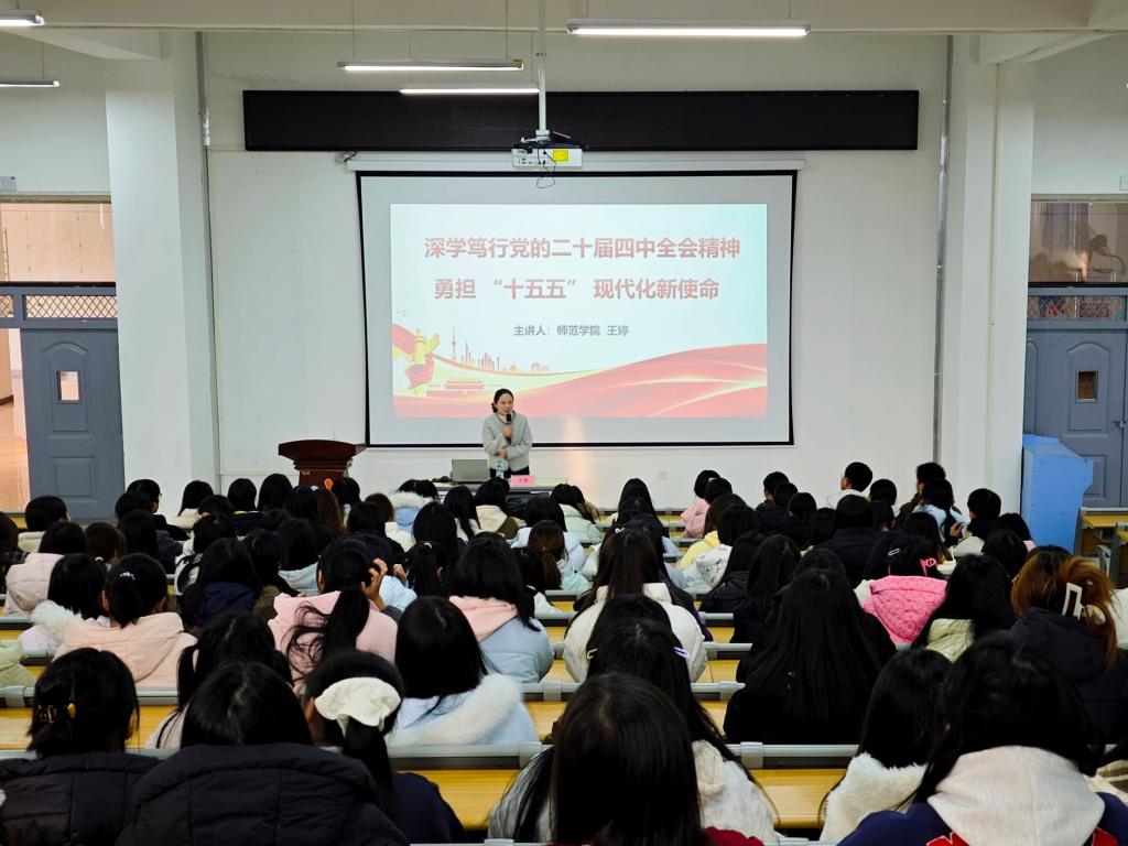 本站讯(师范学院 王焕 学生记者 龚洋涵 黄建晔)为深入学习贯彻党的二十届四中全会精神,引导广大青年学生深刻把握国家发展大势与时代责任,12月5日下午,师范学院在正心楼A108教室开展党的二十届四中全会精神学习宣讲活动。学院辅导员、青年五四奖章获得者王婷担任主讲。来自各班级的300名学生共同参加学习。