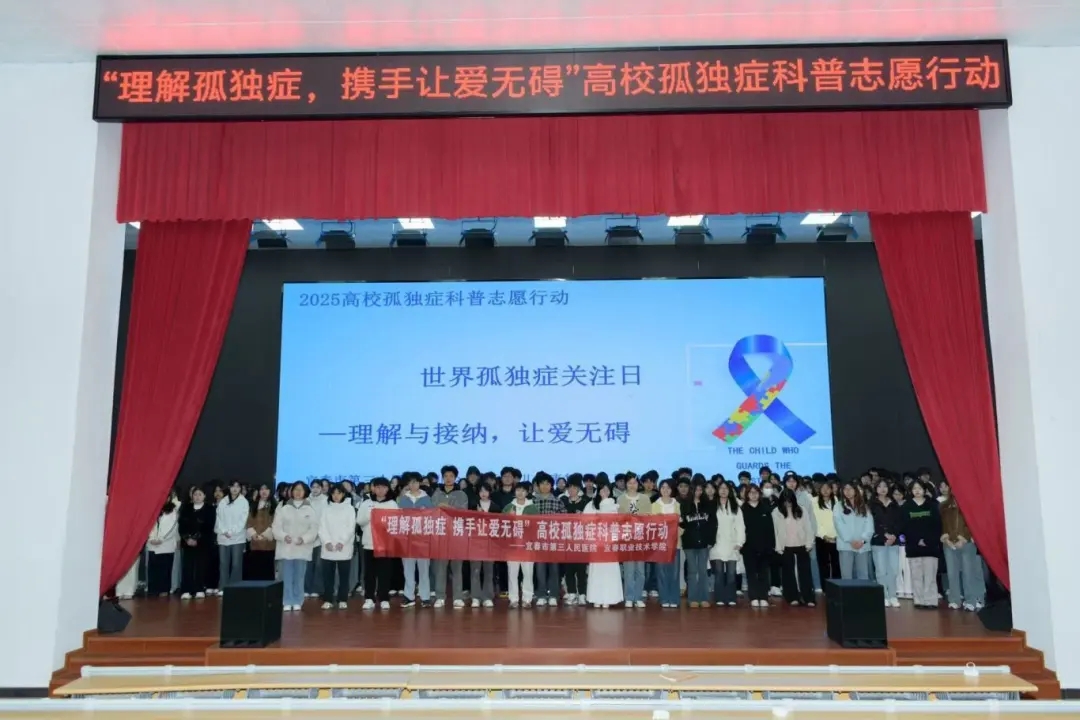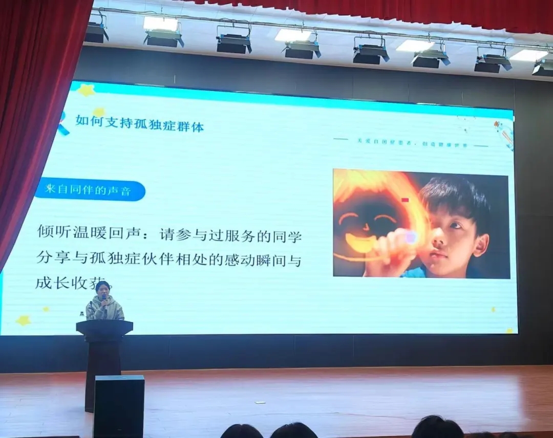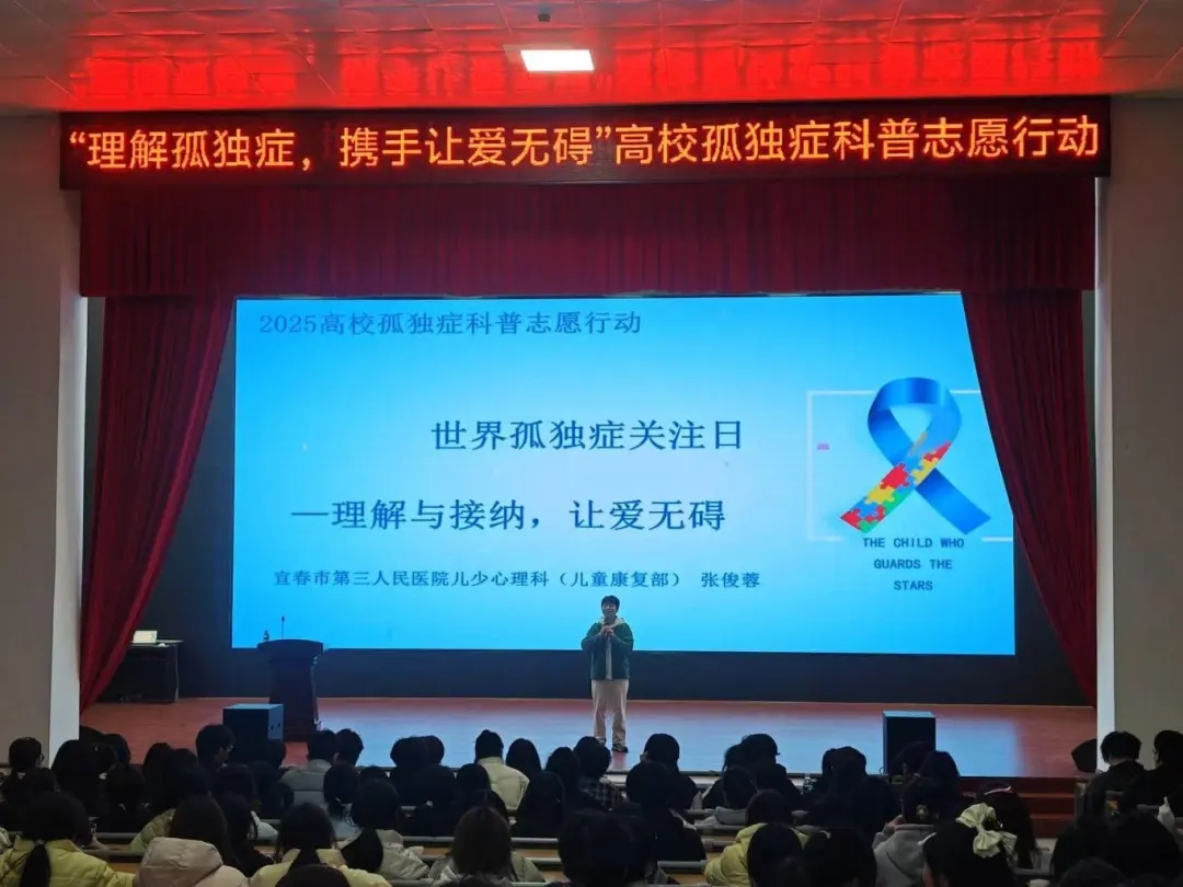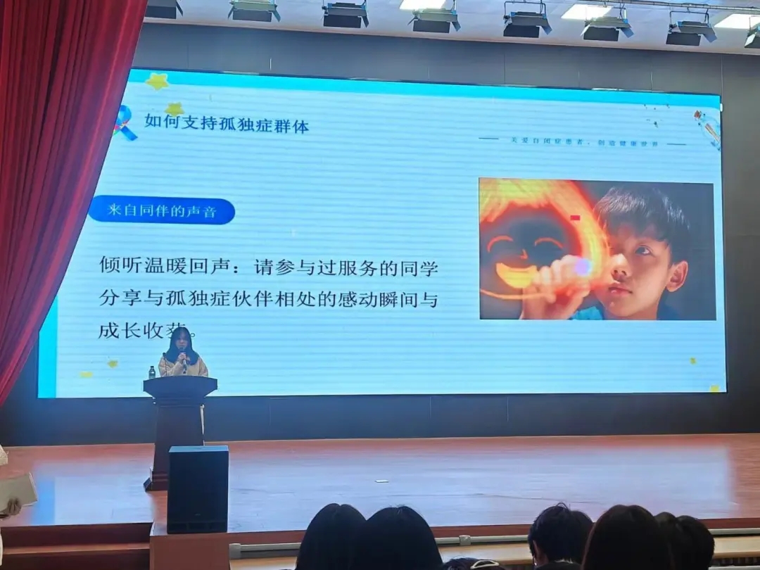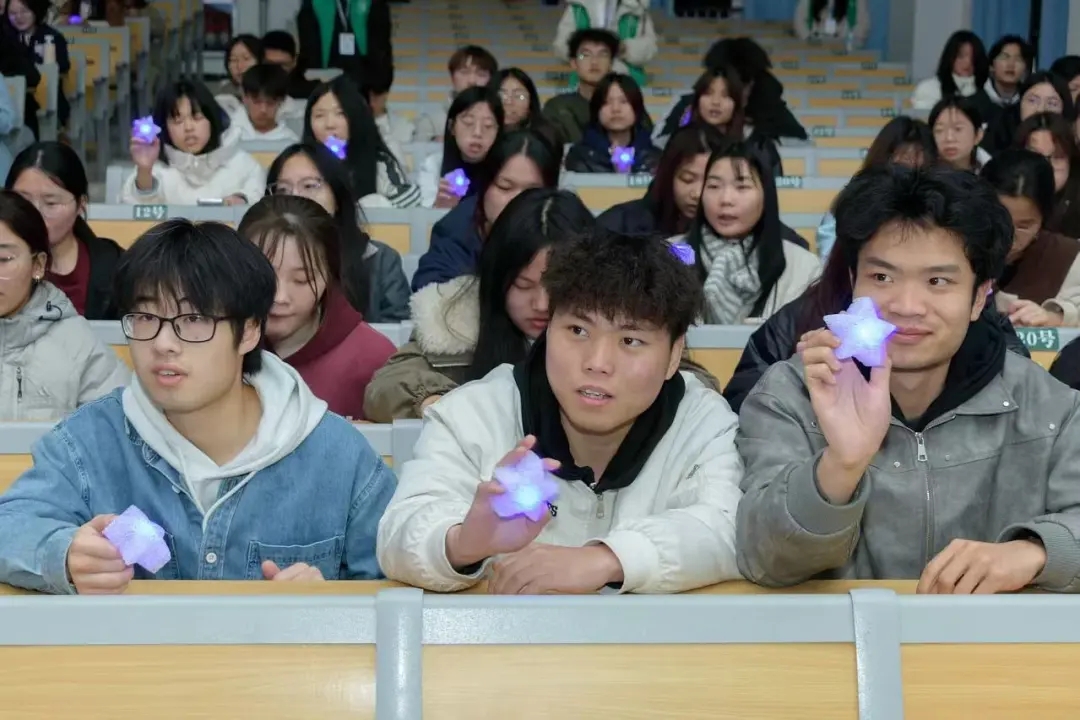 本站讯(团委 张为岷 刘嘉妮 王玮 学生记者 邹欣宇 鲁思甜)为提高公众对孤独症群体的认知,倡导社会包容与支持,迎接4月2日世界孤独症日,3月31日晚,买球官网团委和校友办联合开展“理解孤独症,携手让爱无碍”高校孤独症科普志愿行动,此次活动特邀宜春市第三人民医院健康复疗师、校友张俊蓉走进校园进行宣讲。首先,主讲人张俊蓉围绕孤独症的定义、孤独症的特点、孤独症的病因、孤独症的发展现状以及如何支持孤独症群体等方面展开讲座,让同学们全方位了解孤独症。随后,由两名志愿者上台讲述了与孤独症群体接触的温馨故事,表达自己对孤独症群体的理解与感触,号召大家一起关心孤独症群体。紧接着,全体参与者举灯合唱《追光者》,温暖的歌声不仅引发强烈共鸣,更让同学们在沉浸式体验中加深了对孤独症群体的理解与关爱。最后,全体参与者共同合影留念,纪念这极具意义的时刻,将美好于此刻化作永恒。