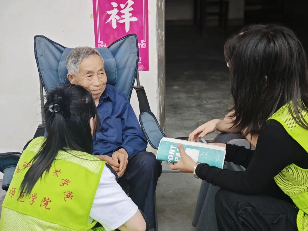 本站讯(团委 张为岷 刘嘉妮 王玮 学生记者 曾雅萱 汤包根)为深入学习贯彻习近平总书记关于青年工作的重要思想,进一步落实《教育强国建设规划纲要(2024—2035年)》中关于语言文字工作的战略部署,大力推广国家通用语言文字,以语言之力赋能乡村振兴,6月23日至30日,体育买球官方网站师范学院“推普兴乡 ‘语’你同行”实践团队前往九江市庐山市温泉镇通书院村开展了为期八天的暑期“三下乡”社会实践活动。为精准有效地开展推普工作,实践团队深入了解了通书院村的村情民情,在驻村干部陶钧同志的引导下,团队参观了承载着乡愁记忆的村史馆,并实地考查了村内灵芝产业园、唐家湾天井老屋以及“宿写南山·五柳古村”特色名宿,综合探究通书院村的历史文化和发展现状,把握当地村民的实际需求与推普工作的切入点,为后续活动高效开展奠定了基础。此外,实践团队还专程走访慰问了村内两位光荣在党50年的老党员余德森和邹俊林,认真聆听老党员讲述社会主义革命和建设时期的奋斗经历,并为他们拍摄制作专题视频,这不仅是对老党员们的一次深情关怀,更是一堂生动的党史教育课。老党员们用自己的一生诠释了对党的忠诚和对事业的执着,他们的奋斗精神和崇高品格是激励着我们当代大学生砥砺前行的宝贵精神财富,为推普工作注入了文化内涵和精神动力。为加强推普工作力度,队员们分组走村入户,与村民面对面交流,调查分析不同年龄段村民的普通话听说能力现状、使用频率及学习意愿,向村民讲解普通话在日常沟通、获取信息等方面的重要性和便利性,通过发放推普宣传材料、分享学习普通话的有效方法,激发了村民学习普通话的内在动力,提升了他们使用普通话进行基本沟通的信心和能力。结合“6.26”国际禁毒日契机,在入户推普走访过程中,队员们向村民普及法律知识和毒品危害。实践队伍面向村民开展“幸福笑脸采集”活动,与村民们亲切交谈,记录村民的淳朴生活与积极面貌,传递温暖,让推普工作更加深入人心。实践团队聚焦“推广普及国家通用语言文字”专题活动,来到温泉镇明珠幼儿园,为孩子们带来了丰富多彩、寓教于乐的趣味课程。通过《小瓢虫绘画》创作活动引导孩子们用普通话描述颜色和形状;在“老鹰抓小鸡”等户外游戏中融入简单的普通话指令和互动儿歌;结合运动歌进行音乐律动,在唱跳中自然习得普通话韵律和词汇。课后,队员们主动为幼儿整理床铺、床架,用实际行动传递志愿精神,营造良好育人环境。针对小学生,团队在唐家湾童心港湾开设了更系统的推普课堂。以解决当地常见的方言发音问题为抓手,开展了普通话基础发音教学,帮助小学生掌握标准发音;用标准、生动、富有感情的普通话讲述红色故事,传承红色基因,提供优质普通话听、写、讲模仿范例;在书法艺术体验课程中,结合汉字书写讲解其标准的普通话读音和基本含义,让乡村儿童感受汉字与普通话的魅力。此外,还设计了形式多样的普通话应用活动,如普通话配音秀、广播员体验等,通过游戏化、互动化的方式,全面激发小学生学习和运用普通话的热情,营造了浓厚的语言学习氛围。团队通过问卷调查等方式了解推普课堂成效,孩子们纷纷表示在课程中收获颇多,立志以后要好好学习,讲好普通话。