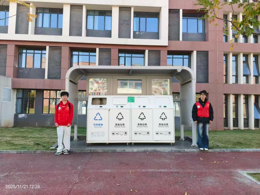 21日,志愿者来到学校各处智能垃圾箱旁,向来往的同学介绍垃圾分类知识,引导同学们树立垃圾分类的环保意识,倡导同学们积极参与到垃圾分类的行动中来,助力绿色校园建设。