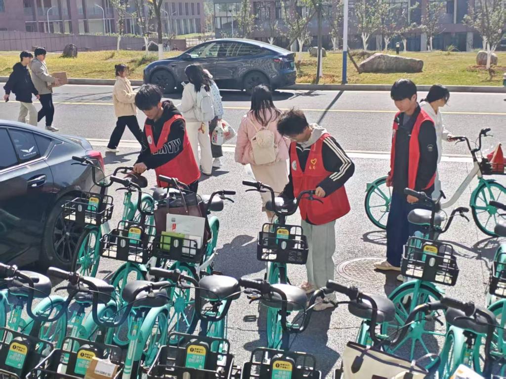 26日中午,志愿者来到学校各处共享单车停放点,将停放不规范的单车逐一搬运至指定停放区域,并按照“车头同向、整齐排列”的标准摆放整齐。活动中,志愿者主动帮助需要帮助的同学,遇到有同学使用单车时,志愿者们主动上前,耐心讲解规范停放的重要性,引导其将单车停放到正确位置。