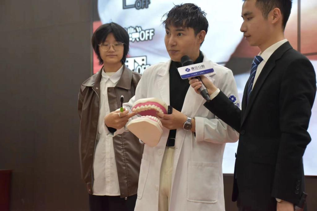 活动中,口腔医生张涛向同学们介绍口腔健康的重要性,常见牙周疾病及治疗方法,朱柯杰医生向大家讲解牙齿不齐带来的问题和危害,并邀请同学们上台体验口腔扫描仪,让大家更直观地了解口腔健康。随后,口腔科医生通过一系列趣味横生的互动环节,让同学们亲身感受口腔健康知识的重要性。讲座最后,主持人对本次活动进行总结,他表示口腔健康对每个人的生活至关重要,希望同学们能够重视口腔保健,养成良好的口腔卫生习惯。