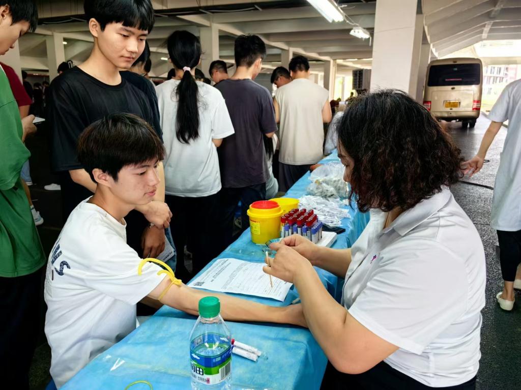 新生入学体检涵盖实验室检查、胸片、内科、外科、眼耳鼻喉科等项目。体检期间,学校在体检区域出入口安排了志愿者引导分流,新生们按照院系分时、分批、分段有序参加体检。抽血现场,为应对学生可能出现晕血及低血糖等情况,附属医院准备了急救药品、糖块和饮用水,医务人员现场巡视。