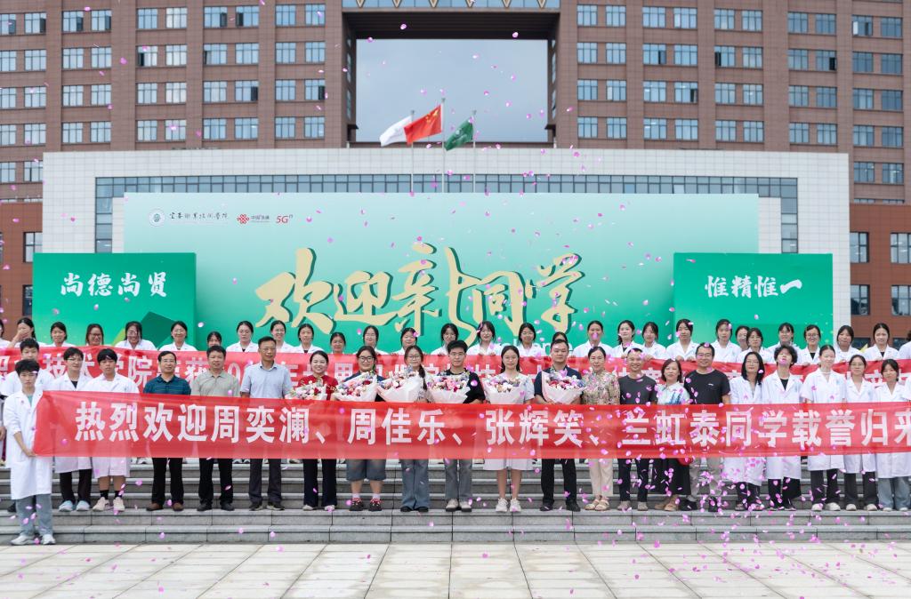 9月2日下午,校党委副书记、校长李铁刚,校党委委员、副校长刘叶建等有关部门负责人以及医学院师生代表在开物广场迎接获奖团队载誉归来。李铁刚代表学校向获奖团队致以热烈祝贺,对他们为学校赢得荣誉以及付出的辛勤努力表示衷心感谢。随后,为获奖师生赠送鲜花,现场礼炮轰鸣、掌声如雷、欢呼声此伏彼起。